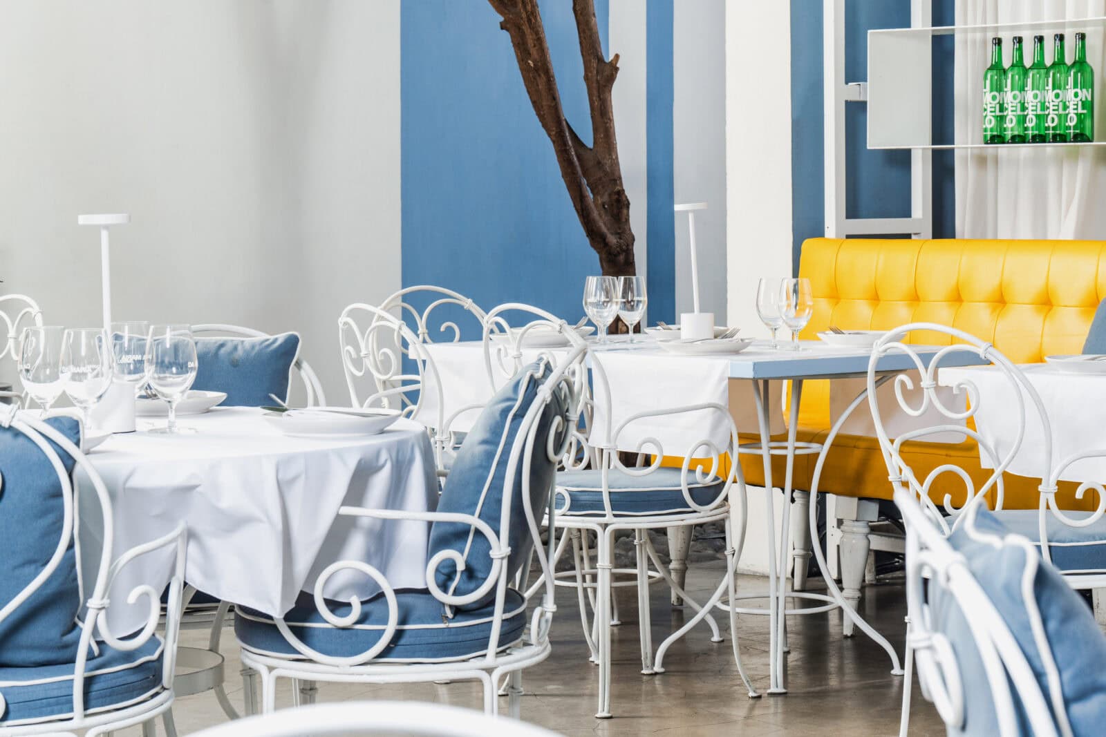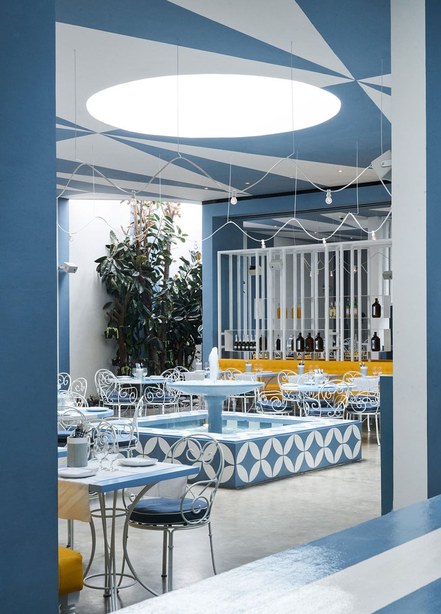 Carl Pickering of Lazzarini Pickering Architects focused on a design very reminiscent of a 1960’s Amalfi Coast courtyard with a cooling, fresh blue and white palette and bold geometric styling. The design pays homage to legendary Italian designer Giò Ponti, who created the iconic Sorrento hotel il Parco dei Principi in 1960 – the first “Design Hotel” – where he designed everything, including the magnificent graphic tiles. In Da Maria, Pickering wanted to create a cool, fresh space with air conditioning that also felt like a garden. The team at Da Maria wished to bring about a contemporary reinterpretation of classical Italian hospitality and the design team’s brief was to create a restaurant that represented that idea. Inspired by past images, Da Maria looks very third millennium and resembles no other restaurant in the world.