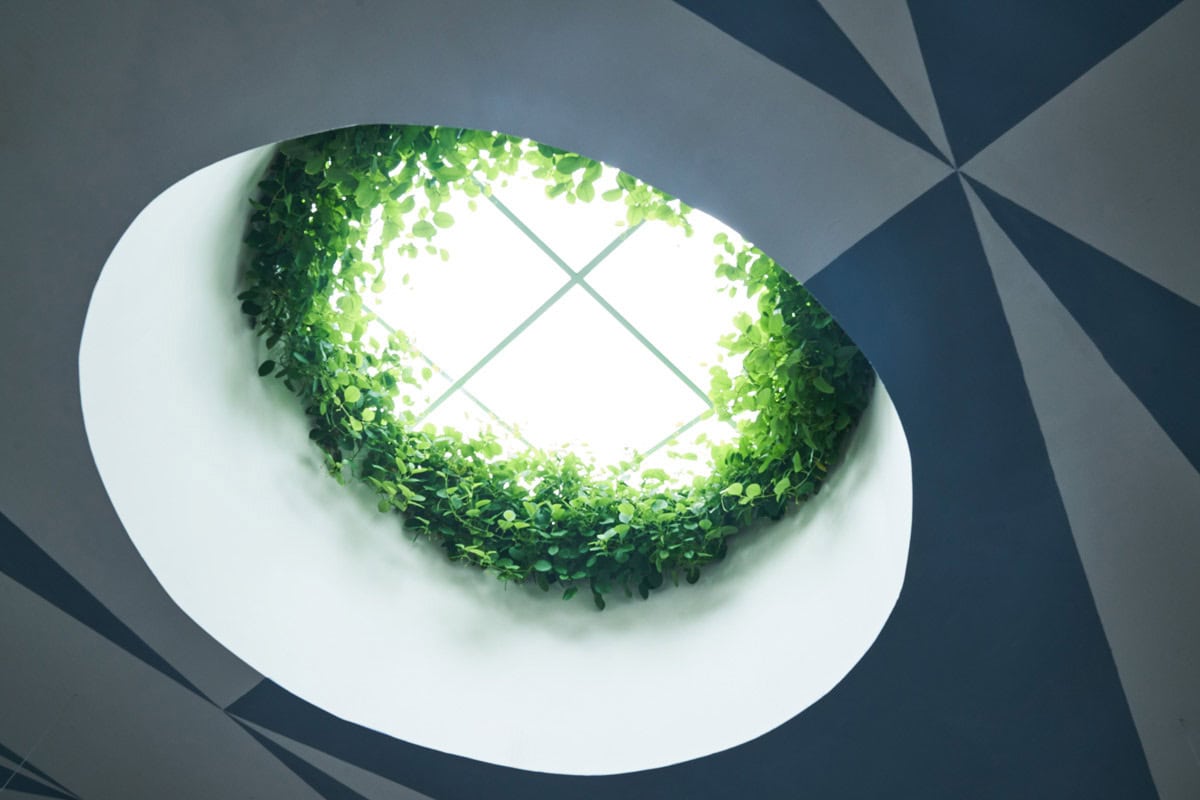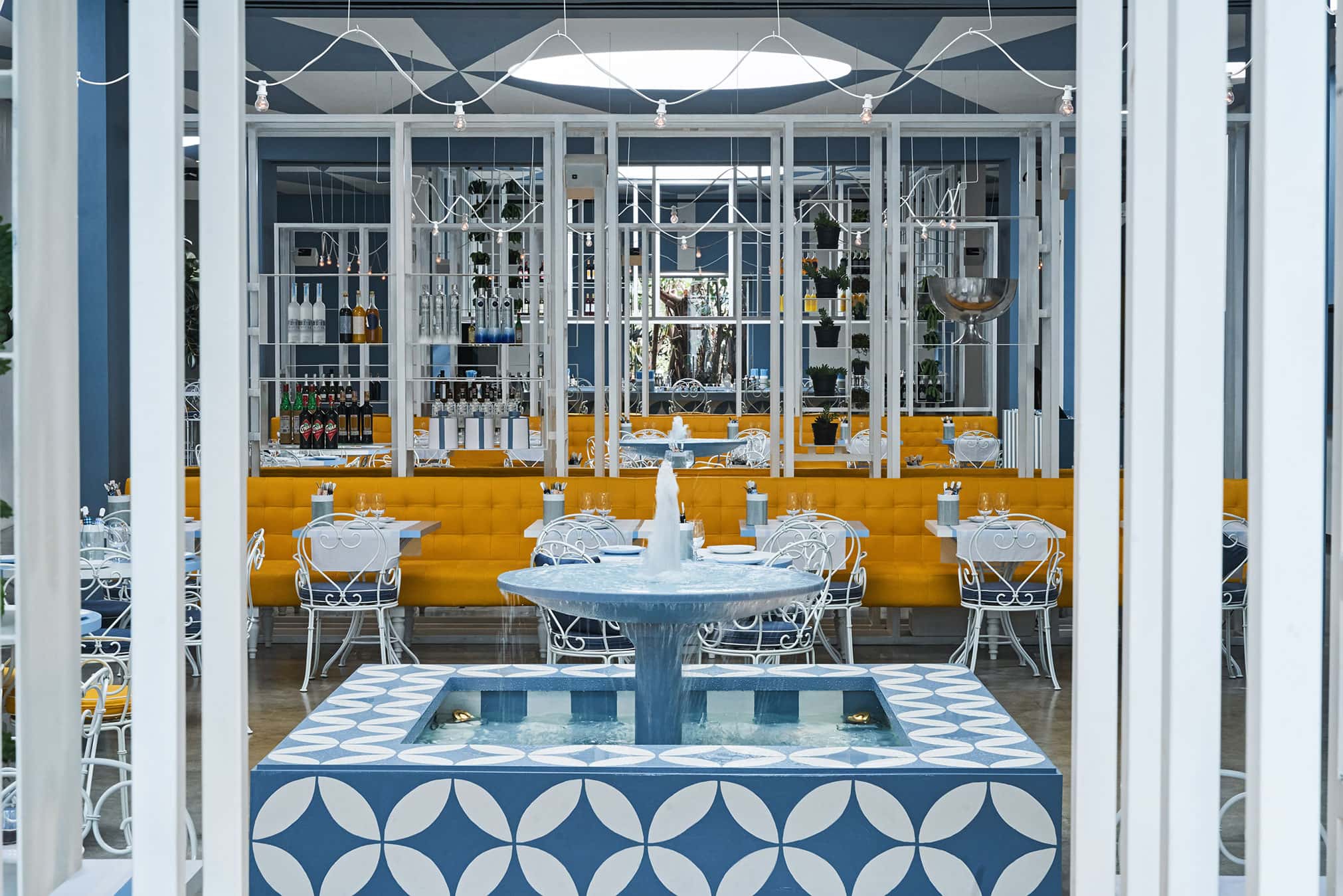 The basis behind the design is unpretentious simplicity with the clean European sensibility offset by typically verdant Balinese greenery of rubber trees, cacti and passionfruit vines spiraling down the walls from the Roman Pantheon-inspired skylights that can be either opened or closed. Three fountains are finished with geometric blue and white tiles and sit beneath locally crafted chandeliers that use simple festoon lighting reminiscent of 60’s Italian courtyard restaurants. Bali is full of these lights so Pickering wanted to devise something different, deciding on a circular chandelier, in the spirit of the beautiful circular chandeliers they created at Icebergs Dining Room and Bar sixteen years ago. The fountain is an Italian and Neapolitan icon but also helps to establish a cool restaurant where the noise of water helps add a refreshing ambiance. There is a very simple fountain in the Santa Chiara cloister in Naples, which came to Pickering mind when designing and with this vision they have recreated the essence of that wonderful part of Italy.