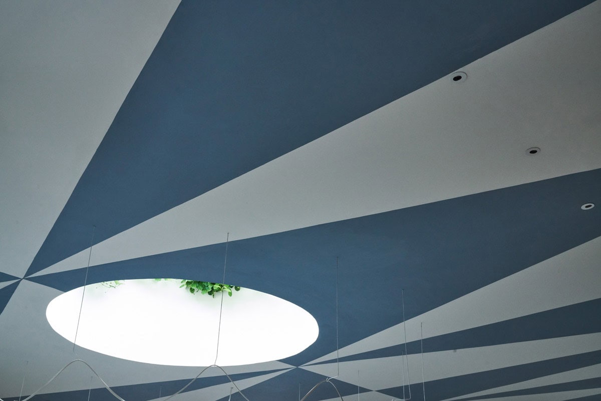The ceiling of Da Maria is the most incredible design element, with Pickering referring to it as “Bali’s Sistine Chapel”. Since the most visible element of the restaurant is the ceiling, the team decided to take some Gio Ponti inspired motifs and enlarge and manipulate them to create the very graphic ceiling that ties in the skylights, the divisions between the rooms and the long, slanted wall along the side. The super-graphic concept was then applied to the other surfaces: where the diagonal Pontiesque lines meet the walls they become stripes. A second graphic was then introduced that resembles the tiles on the bars and fountains. Every aspect has been painstakingly hand-painted by a group of incredible local artists.